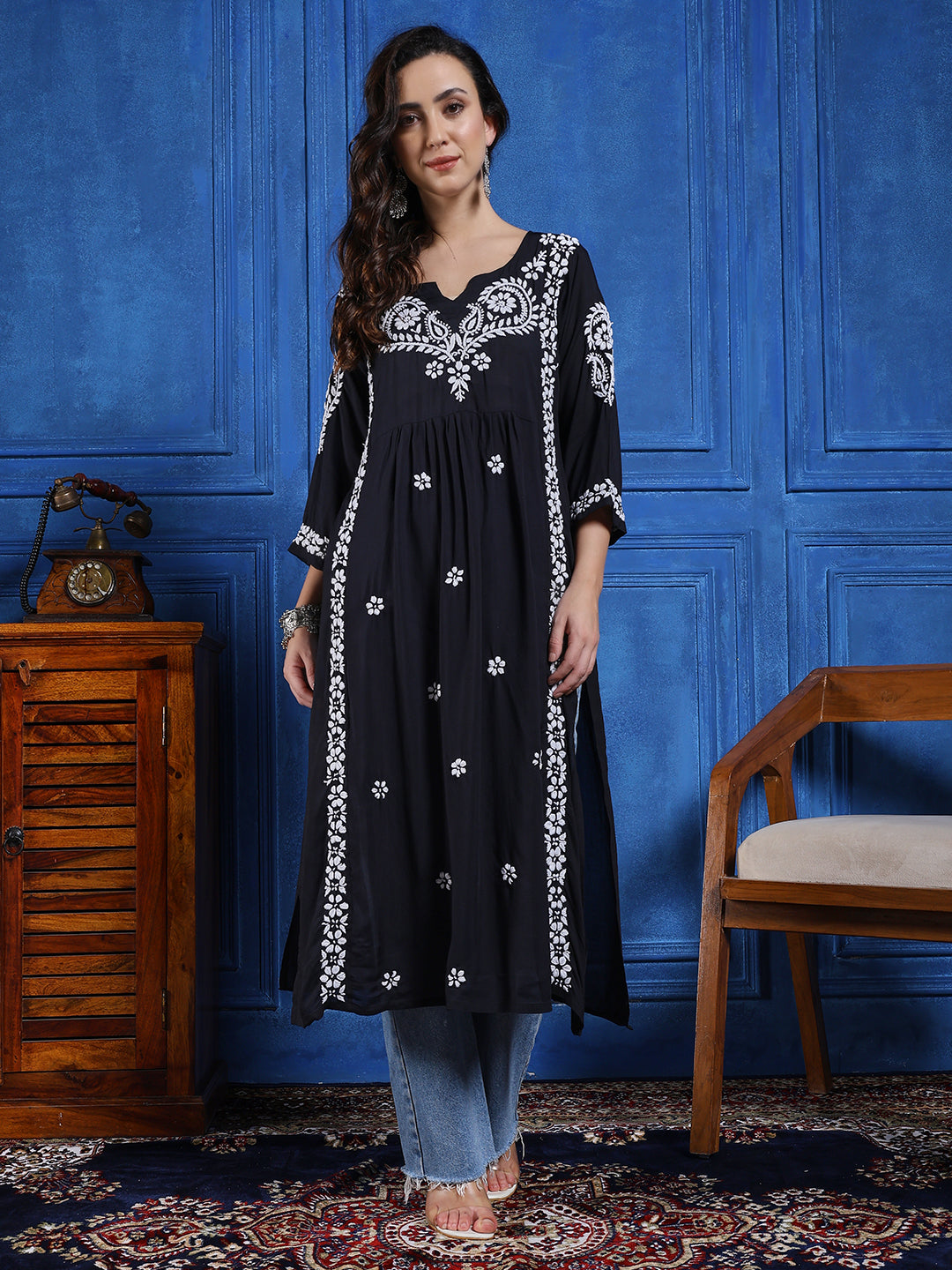 Elevate your ethnic wardrobe with this elegant Women Black Modal Hand Chikankari Long Kurta, a timeless piece that beautifully blends comfort and tradition. Crafted from premium Modal fabric, this kurta features intricate hand-embroidered Chikankari work in contrasting white threads, showcasing floral and traditional motifs. The lightweight, breathable fabric makes it perfect for both everyday wear and special occasions. Pair it with palazzos, straight pants, or even jeans for a versatile look that transitions effortlessly from day to evening.